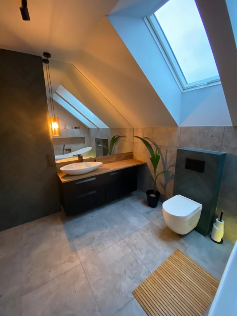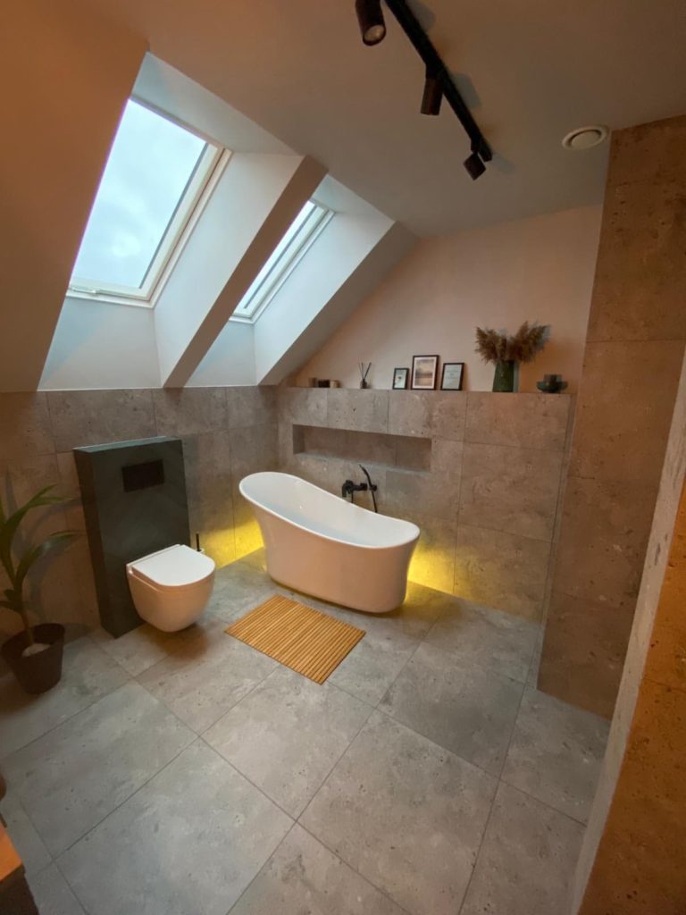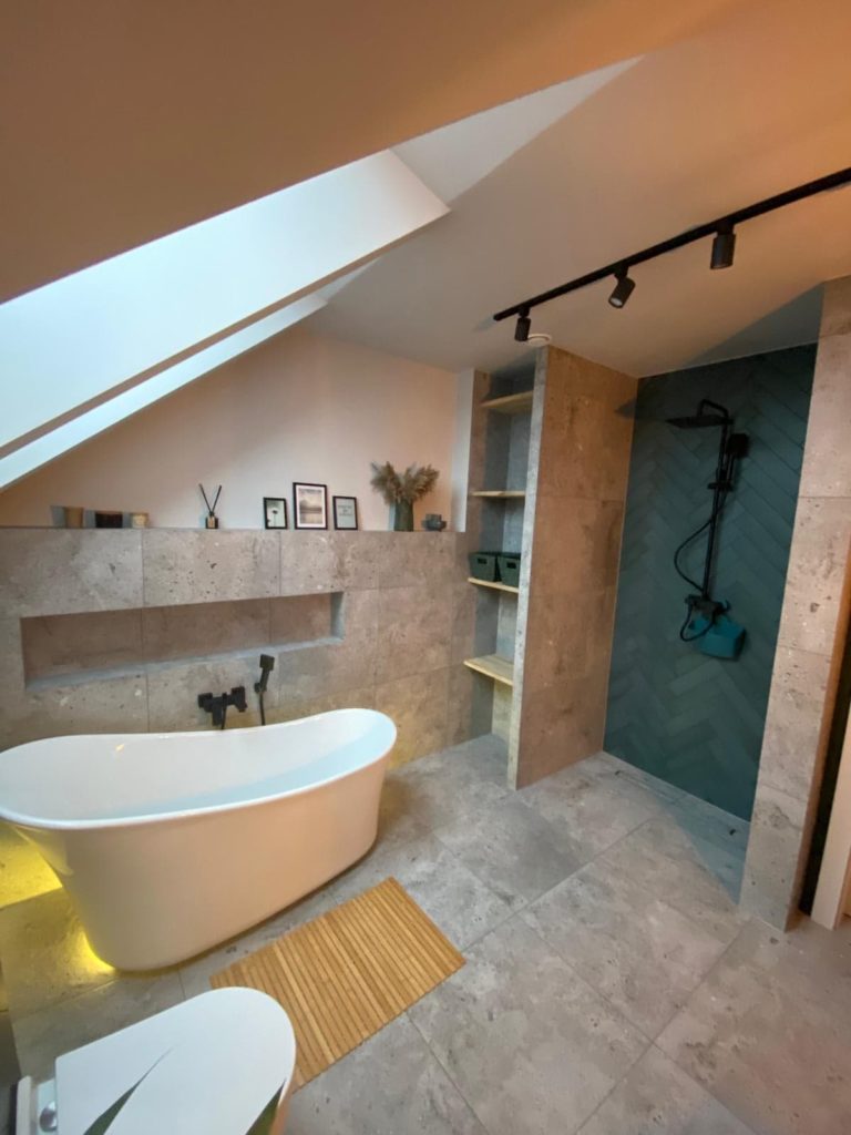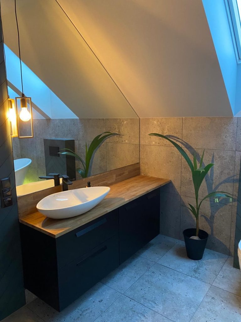 Ciekawie, a na pewno odważnie i stylowo. Nieczęsto spotykamy takie łazienki. W pokoju podwieszany sufit z halogenami i pionowe ścianki zabudowy.